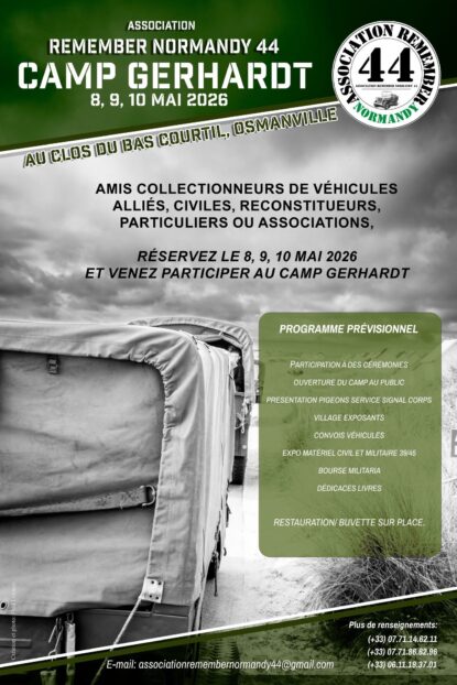 CatégorieSalonReconstitutionRassemblement VéhiculesExpositionCommémorationBourse militaireLocalisation (Département / Région / Pays)Vaucluse (84)Var (83)Seine Maritime (76)Seine et Marne (77)Royaume-UnisPas de Calais (62)Paris (75)Oise (60)Nord (59)Moselle (57)Morbihan (56)Marne (51)Manche (50)Maine et Loire (49)LUXEMBOURGLoiret (45)Isère (38)Haute Savoie (74)Haut Rhin (68)Gironde (33)Gard (30)FranceEure et Loire (28)Eure (27)Essonne (91)Côtes d'Armor (22)Calvados (14)Bouches du Rhone (13)BelgiqueArdennes (08)AllemagneAisne (02)Rechercher ExpositionRassemblement VéhiculesReconstitutionBrasserie Elfique – AYWAILLE (Belgique)23 novembre 202523 novembre 2025Bourse militaireBOURSE de WINGLES (62)30 novembre 2025CommémorationRassemblement VéhiculesReconstitutionMANHAY12 décembre 202514 décembre 2025Rassemblement VéhiculesWINTER RALLY20 février 202622 février 2026Bourse militaireRassemblement VéhiculesReconstitutionCAMP GERHARDT – OSMANVILLE (14)8 mai 202610 mai 2026Rassemblement VéhiculesReconstitutionULBEEK ( Belgique)22 mai 202624 mai 2026Rassemblement VéhiculesSAINT SEBASTIEN DE RAID25 juillet 202626 juillet 2026