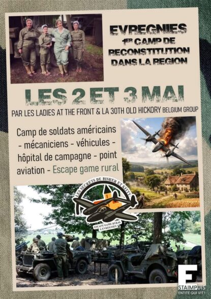 CatégorieSalonReconstitutionRassemblement VéhiculesExpositionCommémorationBourse militaireLocalisation (Département / Région / Pays)Vosges (88)Vaucluse (84)Var (83)TARN 81Somme (80)Seine Maritime (76)Seine et Marne (77)Royaume-UnisPas de Calais (62)Paris (75)Oise (60)Nord (59)Moselle (57)Morbihan (56)Meuse (55)MayenneMarne (51)Manche (50)Maine et Loire (49)LUXEMBOURGLoiret (45)Loire Atlantique 44Isère (38)Indre et Loire (37)Haute Savoie (74)Haut Rhin (68)Gironde (33)Gard (30)FranceEure et Loire (28)Eure (27)Essonne (91)Essonne (91)Côtes d'Armor (22)Côte d'Or (21)Calvados (14)Bouches du Rhone (13)BelgiqueBas-Rhin (67)Ardennes (08)AllemagneAisne (02)Rechercher Rassemblement VéhiculesSTOUMONT (Belgique)12 avril 202612 avril 2026ExpositionRassemblement VéhiculesReconstitutionMASNUY SAINT-JEAN (BELGIQUE)17 avril 202619 avril 2026Rassemblement VéhiculesReconstitutionNEUVILLE SUR MARGIVAL (02)25 avril 202626 avril 2026ExpositionRassemblement VéhiculesReconstitutionSAINT GILLES (30)25 avril 202626 avril 2026Rassemblement VéhiculesReconstitutionBOURG FIDELE (08)25 avril 202618 avril 2026ExpositionRassemblement VéhiculesReconstitutionFOUQUIERES LES BETHUNES (62)1 mai 20263 mai 2026Bourse militaireExpositionRassemblement VéhiculesReconstitutionDENAT (81)2 mai 20263 mai 2026ExpositionRassemblement VéhiculesReconstitutionEVREGNIES (Belgique)2 mai 20263 mai 2026Bourse militaireRassemblement VéhiculesReconstitutionCASSON (Loire Atlantique)7 mai 202610 mai 2026Bourse militaireRassemblement VéhiculesReconstitutionCAMP GERHARDT – OSMANVILLE (14)8 mai 202610 mai 2026ExpositionRassemblement VéhiculesReconstitutionDOUVRIN (62)8 mai 202610 mai 2026ExpositionRassemblement VéhiculesReconstitutionFLORENNES (Belgique)8 mai 202610 mai 2026 1 2 3 … 6