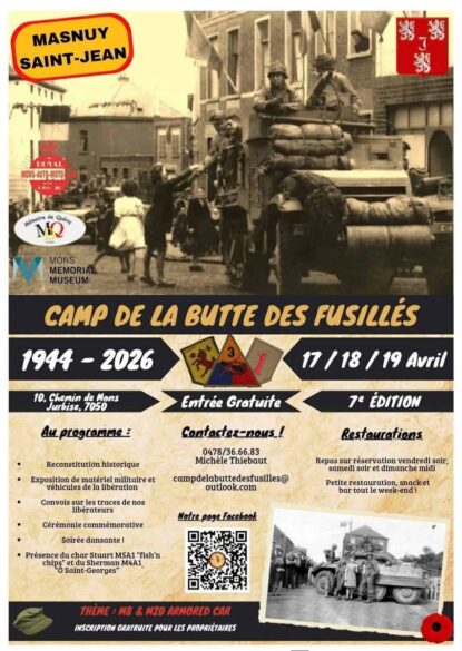 CatégorieSalonReconstitutionRassemblement VéhiculesExpositionCommémorationBourse militaireLocalisation (Département / Région / Pays)Vosges (88)Vaucluse (84)Var (83)TARN 81Somme (80)Seine Maritime (76)Seine et Marne (77)Royaume-UnisPas de Calais (62)Paris (75)Oise (60)Nord (59)Moselle (57)Morbihan (56)Meuse (55)MayenneMarne (51)Manche (50)Maine et Loire (49)LUXEMBOURGLoiret (45)Loire Atlantique 44Isère (38)Indre et Loire (37)Haute Savoie (74)Haut Rhin (68)Gironde (33)Gard (30)FranceEure et Loire (28)Eure (27)Essonne (91)Essonne (91)Côtes d'Armor (22)Côte d'Or (21)Calvados (14)Bouches du Rhone (13)BelgiqueBas-Rhin (67)Ardennes (08)AllemagneAisne (02)Rechercher Rassemblement VéhiculesSTOUMONT (Belgique)12 avril 202612 avril 2026ExpositionRassemblement VéhiculesReconstitutionMASNUY SAINT-JEAN (BELGIQUE)17 avril 202619 avril 2026Rassemblement VéhiculesReconstitutionNEUVILLE SUR MARGIVAL (02)25 avril 202626 avril 2026ExpositionRassemblement VéhiculesReconstitutionSAINT GILLES (30)25 avril 202626 avril 2026Rassemblement VéhiculesReconstitutionBOURG FIDELE (08)25 avril 202618 avril 2026ExpositionRassemblement VéhiculesReconstitutionFOUQUIERES LES BETHUNES (62)1 mai 20263 mai 2026Bourse militaireExpositionRassemblement VéhiculesReconstitutionDENAT (81)2 mai 20263 mai 2026ExpositionRassemblement VéhiculesReconstitutionEVREGNIES (Belgique)2 mai 20263 mai 2026Bourse militaireRassemblement VéhiculesReconstitutionCASSON (Loire Atlantique)7 mai 202610 mai 2026Bourse militaireRassemblement VéhiculesReconstitutionCAMP GERHARDT – OSMANVILLE (14)8 mai 202610 mai 2026ExpositionRassemblement VéhiculesReconstitutionDOUVRIN (62)8 mai 202610 mai 2026ExpositionRassemblement VéhiculesReconstitutionFLORENNES (Belgique)8 mai 202610 mai 2026 1 2 3 … 6